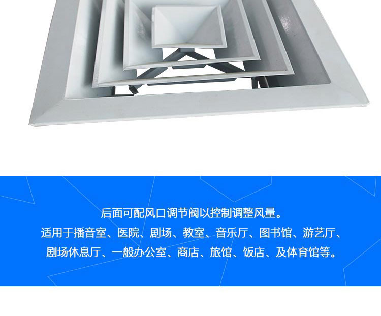方型散流器使用該類型散流器時要與調(diào)節(jié)閥配合使用,才能在系統(tǒng)中得到理想的氣流分布。此風口的葉片角度為固定式,不能隨意調(diào)節(jié),整個葉片與邊框采用分離結(jié)構(gòu)